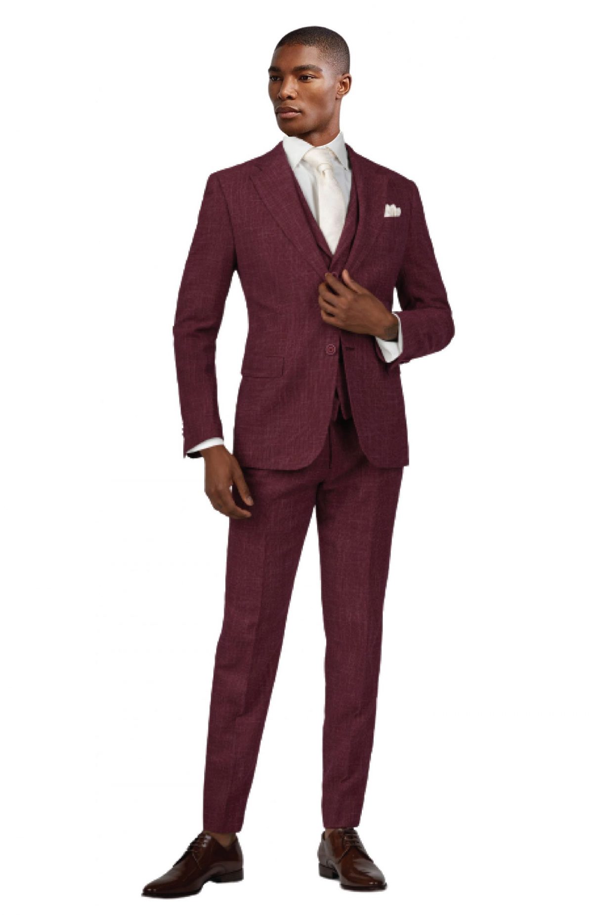 La merveilleuse structure de ce costume trois-pièces deviendra tout ce dont vous avez besoin pour être spectaculaire le jour de votre mariage. Il est fabriqué en tissu 100 % lin de la plus haute qualité, avec une structure semi-entoilée, ce qui lui permet de conserver sa forme, sans déformer les revers. Il est également entièrement doublé pour un confort et une solidité supérieure. Procurez-vous ce fantastique modèle en rouge bordeaux et éblouissez tout le monde avec le style incontesté de Tailored Suit Paris.